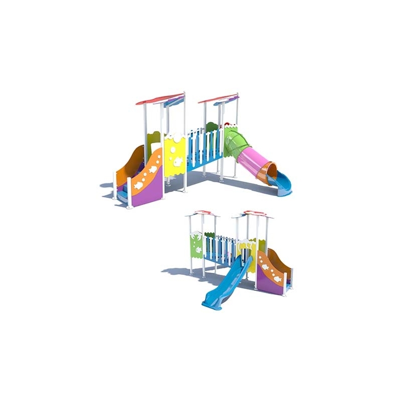 Slide made of polyester reinforced with fiberglass.Posts made of AISI-304 stainless steel, coated in polyester paint.High-density 15 mm polyethylene panels.Outlet nozzles made of polyacetal (POM).Hardware made of stainless steel AISI-304.