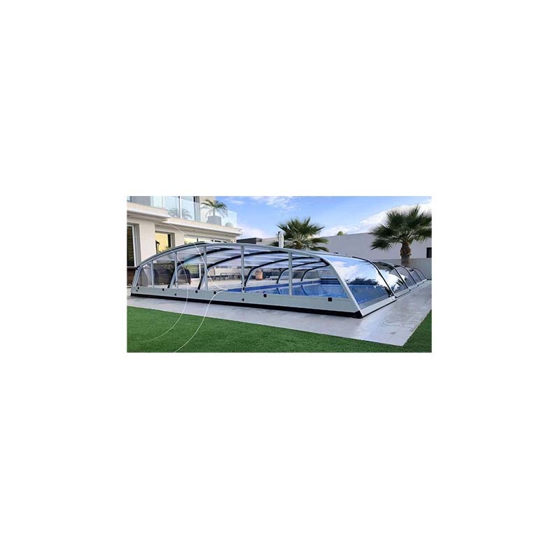 Velsa Mini is a low swimming pool cover, with an aluminium structure and polycarbonate in the roof, sides and front. It allows you to use your swimming pool for longer. It provides protection from accidents and enables you to save on swimming pool maintenance products.