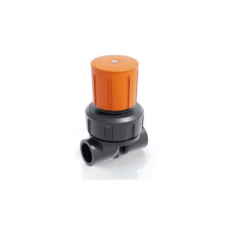 Mini diaphragm valve with BSP threaded female ends. The VM mini valve is used to shut off and regulate fluid flow and is characterized by its reduced size.