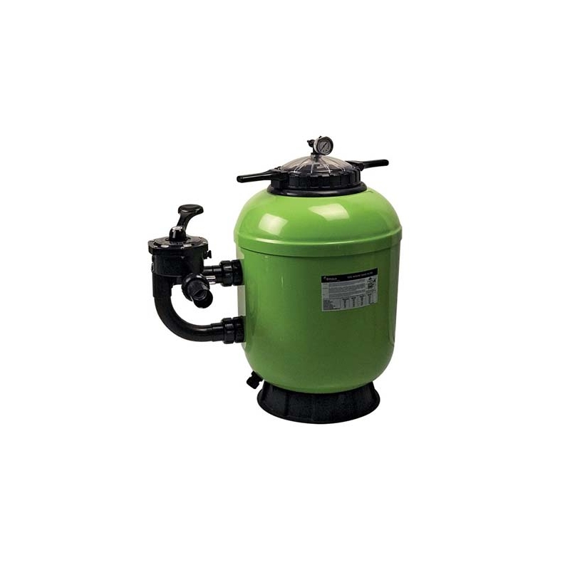 Pool sand filter with side manifold made of GRP and reinforced with fiberglass that provide great mechanical strength and reliability in daily use. The filter features a transparent roof cover for easy bed inspection, twist-lock lid, impeccable polyester finish with gelcoat and a maximum operating pressure of 2.5bar.